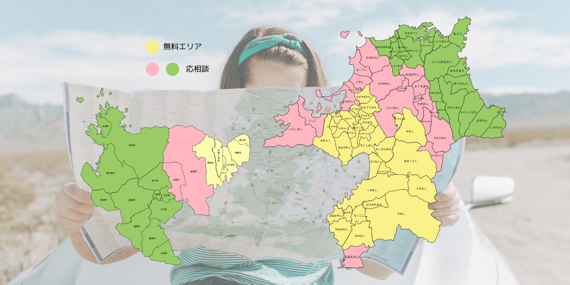 地図上で ピンク・緑で表示されているエリアにつきましては、 移動距離・移動時間の関係上、別途交通費をお願いしています。なお、具体的な金額については、 場所に応じて事前にご相談・ご案内いたしますので、 どうぞお気軽にお問い合わせください。