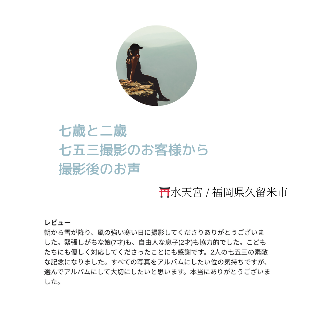 朝から雪が降り、風の強い寒い日に撮影してくださりありがとうございました。緊張しがちな娘(7才)も、自由人な息子(2才)も協力的でした。こどもたちにも優しく対応してくださったことにも感謝です。2人の七五三の素敵な記念になりました。すべての写真をアルバムにしたい位の気持ちですが、選んでアルバムにして大切にしたいと思います。本当にありがとうございました。